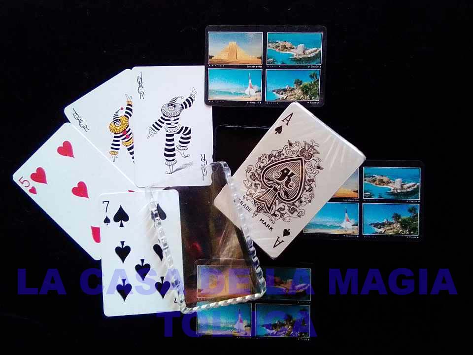 Baraja de colección tamaño bridge. Material plástico. Ideal para jugar, cartomagia o para coleccionistas. Se pueden mojar y no les pasará nada. Tiene los valores de la baraja de juego como son, espadas, treboles, diamates y corazones. 52 cartas y dos jokers. Dorso con imágenes turísticas de destinos mexicanos como Cancún, Chichen Itzá, Acapulco y Tulúm. Viene cerrada con celofán dentro de un estuche plástico, tal como se muestra en la imágen. Foto real del producto.