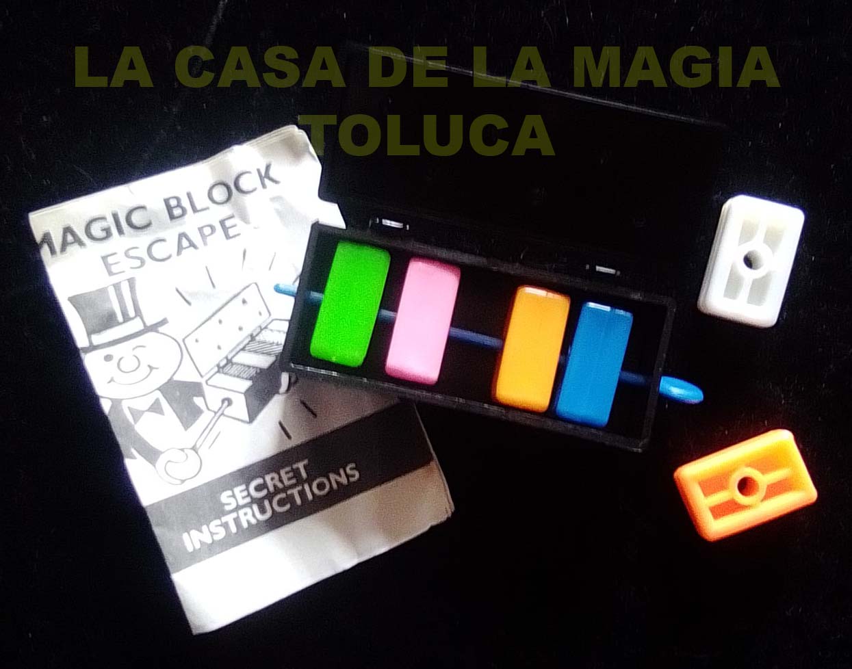 Muestra seis distintos colores de bloques. Pide a uno o dos amigos que nombren dos de esos colores. Todos los bloques son seguramente atrapados por una espadita de plástico dentro de un estuche mágico. Increíblemente como por arte de magia los dos bloques de color elegidos escapan de la espadita. Fácil de hacer. Instructivo en inglés.